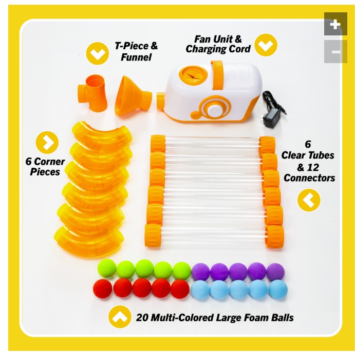 - Includes 20 colorful EVA foam balls, 6 transparent 12-inch tubes, 6 transparent orange corner tubes, 1 T-tube, 1 silicone funnel, 12 easy-fit connectors, 1 fan unit, charging cable