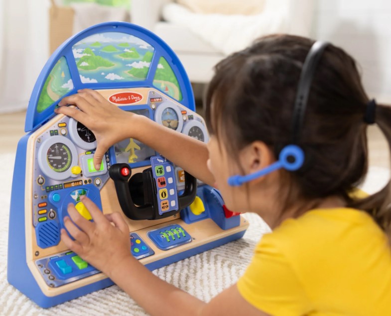 Take to the skies in this new fun wooden airplane dashboard with steering yoke, scrolling map, 4-speed throttle, lights, buttons, switches, and sound effects, including a play headset, checklist, and destination scenes. Throttle controls map speed, yoke moves plane, and destination dial plays greetings and music from 6 locations! 22 amazing sound effects including turbo boost, landing gear, weather effects, and voice recording/playback with voice change. Educational benefits such as light-up dials, fidget switches, and various controls encourage fine motor skills, imaginative play, and language development. Requires 3 AA batteries (not included), features auto shut-off, and is made with FSC-certified materials. Ages 3 6
