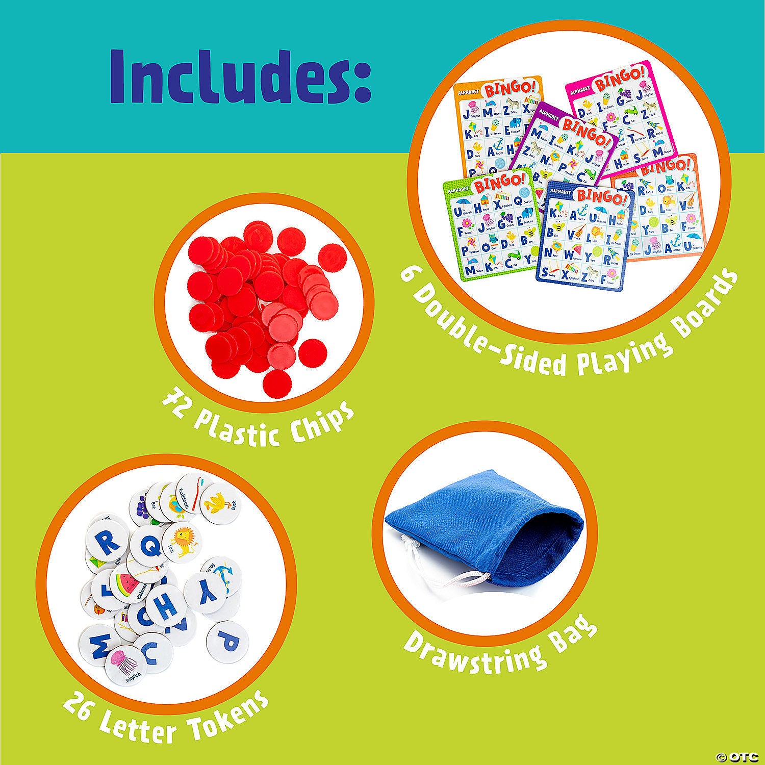 Enjoy a game that teaches the alphabet! This twist on classic Bingo helps kids learn and practice letter names and sounds. Reach into the bag and pull out a letter token—if you have a match, you're on your way to a bingo! It’s easy to play, with six boards so friends and family can join the fun.• Early-learning bingo game for practicing school lessons at home• Develop letter recognition, plus vocabulary and language skills• Instructions include eight game variations to try!• Perfect for home or classroom use• Includes 6 game boards, 26 alphabet tokens, 72 chips, 1 game bag and instructions