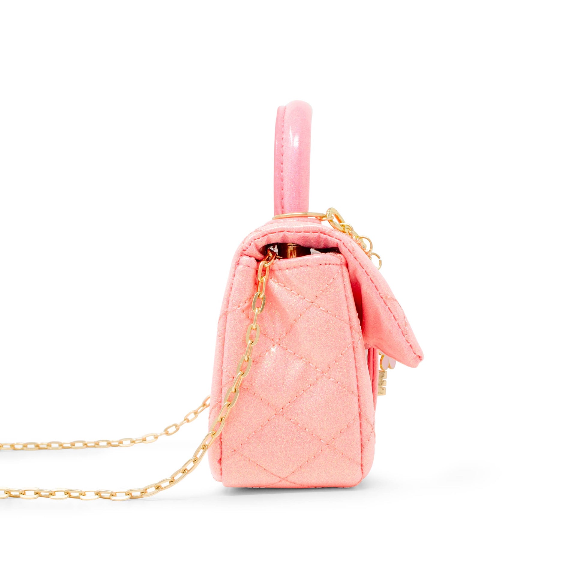 The show-stopping detail? A removable chunky gold chain adorned with playful pink enamel flower charms for extra glam. Whether it’s for a dress-up day, a party outing, or just feeling fabulous, this bag brings the shine.