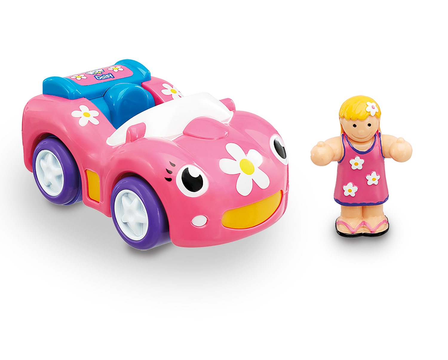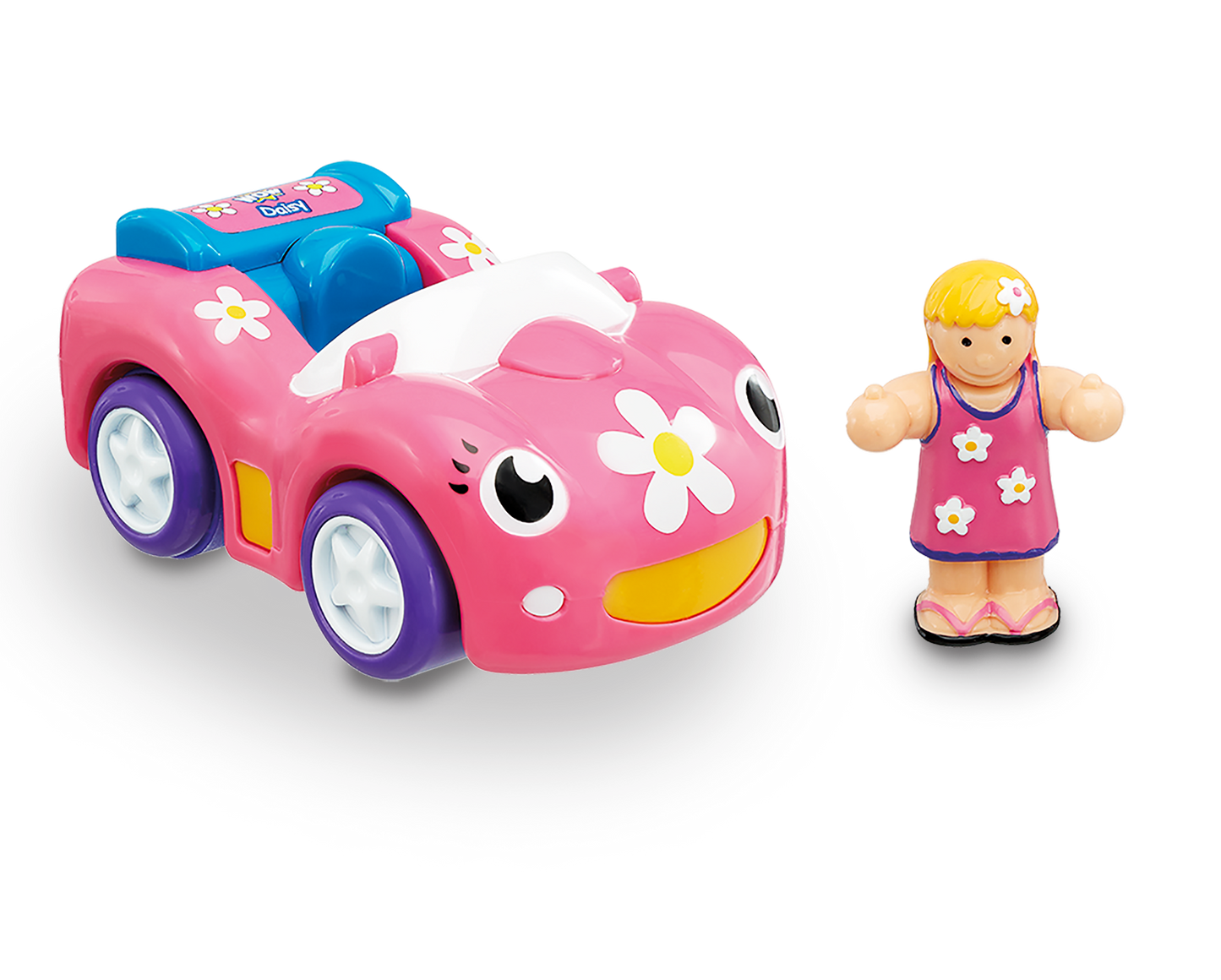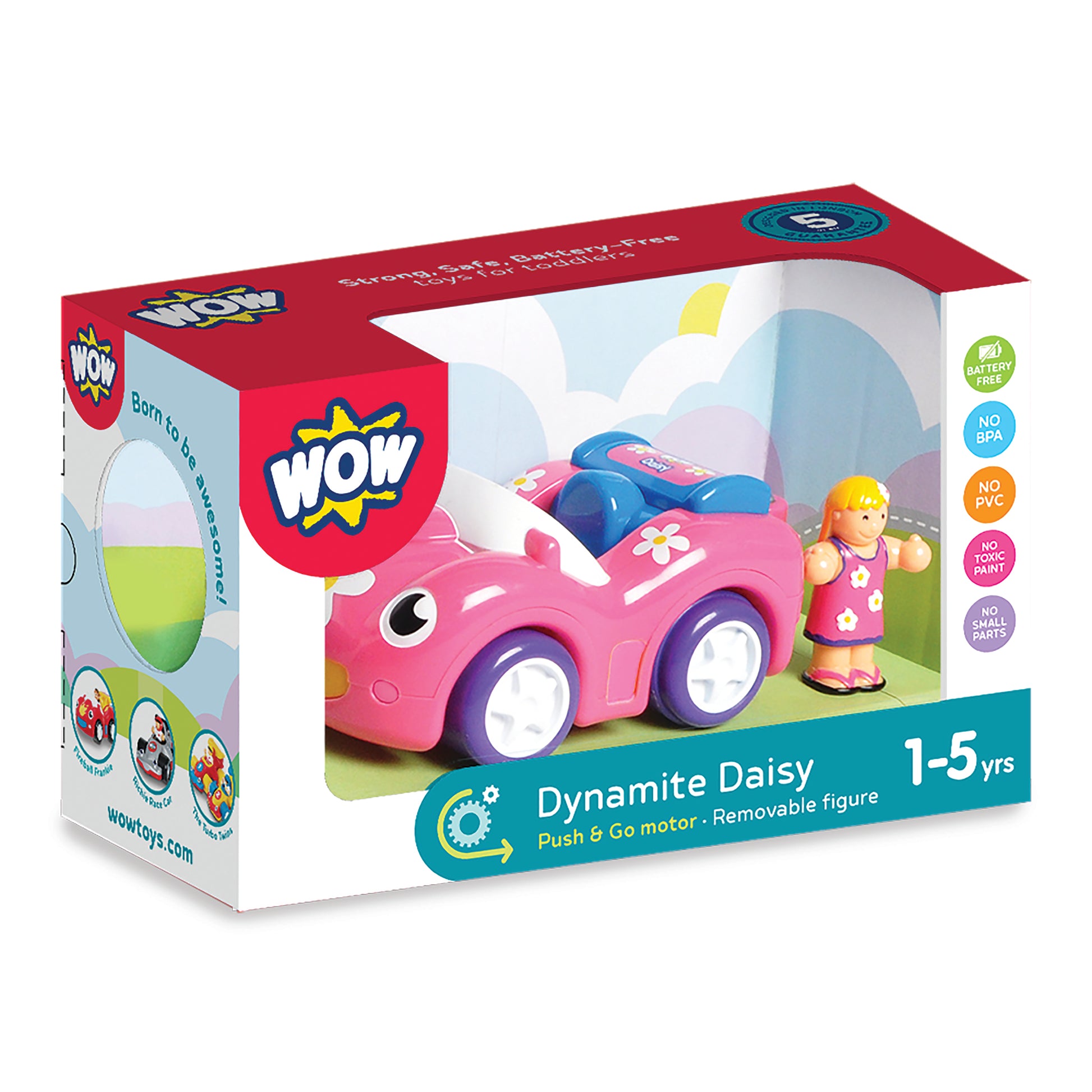 WOW Dynamite Daisy is a battery-powered, push-and-go sports car toy for children ages 1–5. It comes with a removable Play Friend figure and a magnetic hook that attaches to other WOW Toys trailers.