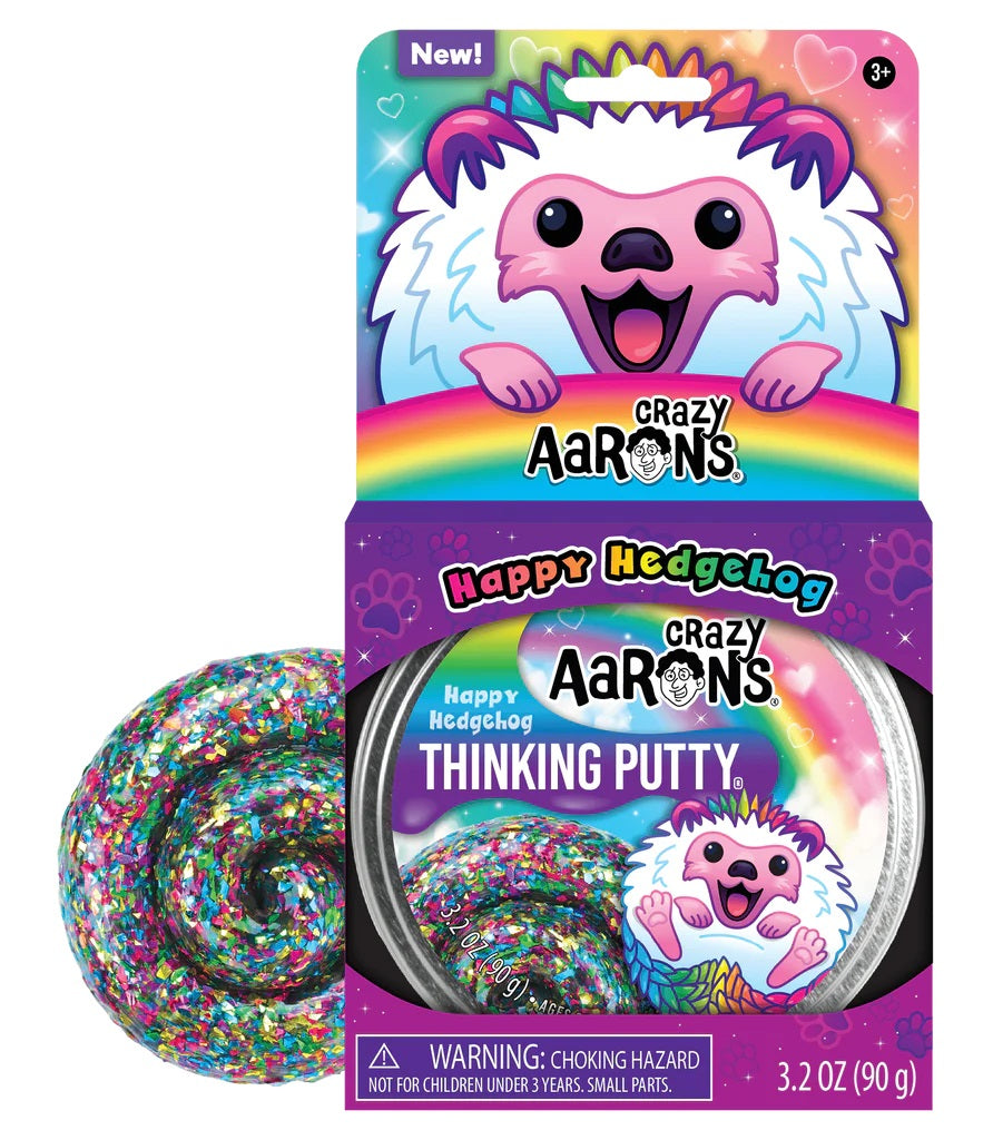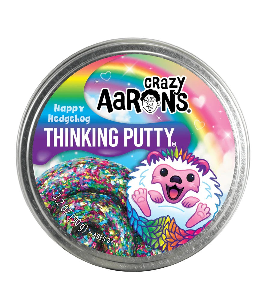 This hedgehog always has a smile on his face, a magical rainbow sky is his ultimate happy place. Look at your Thinking Putty sparkle and shine, it will make you as joyful as this Happy Hedgehog, knowing everything will be fine. Meet your new best friends! Putty Pets Thinking Putty will be your favorite companions for fidget and focus. Collect them all! Thinking Putty helps build hand and finger strength through a fabulous tactile play experience with unique, unexpected properties and provides relaxing, yet stimulating interaction for anyone with sensory integration issues. Crazy Aaron's putty is non-toxic, won't dry out, and won't leave a sticky or slippery residue on your fingers, so it's great for stretching, molding, bouncing, tearing, popping and playing by kids and adults alike. Collection: Trendsetters Putty Pets Includes tin with 1/5 lb. (3.2 oz.) of putty Color: Clear putty with rainbow-colored irregular shaped glitter pieces Features: Stretchable, Sculptable, Soft Texture Materials: Non-toxic silicone Ages: +3