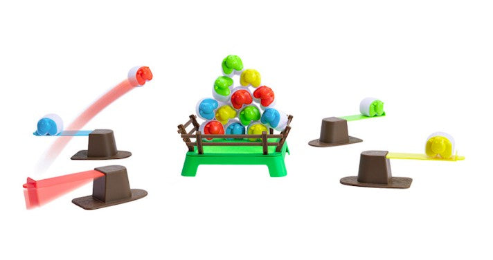 Taking turns, players use their springboard to launch their sheep onto the hook-and-loop paddock.