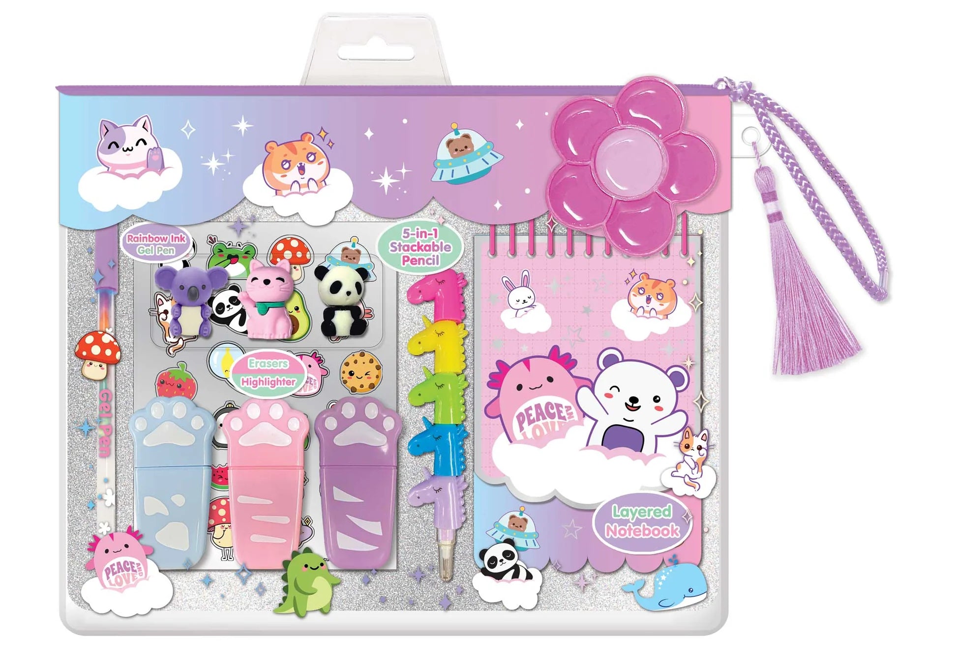 A school set that comes packed in a transparent blister pack. Contents: notebook, graphite pencil in the shape of a unicorn, eraser, signatures, ballpoint pen, stickers.