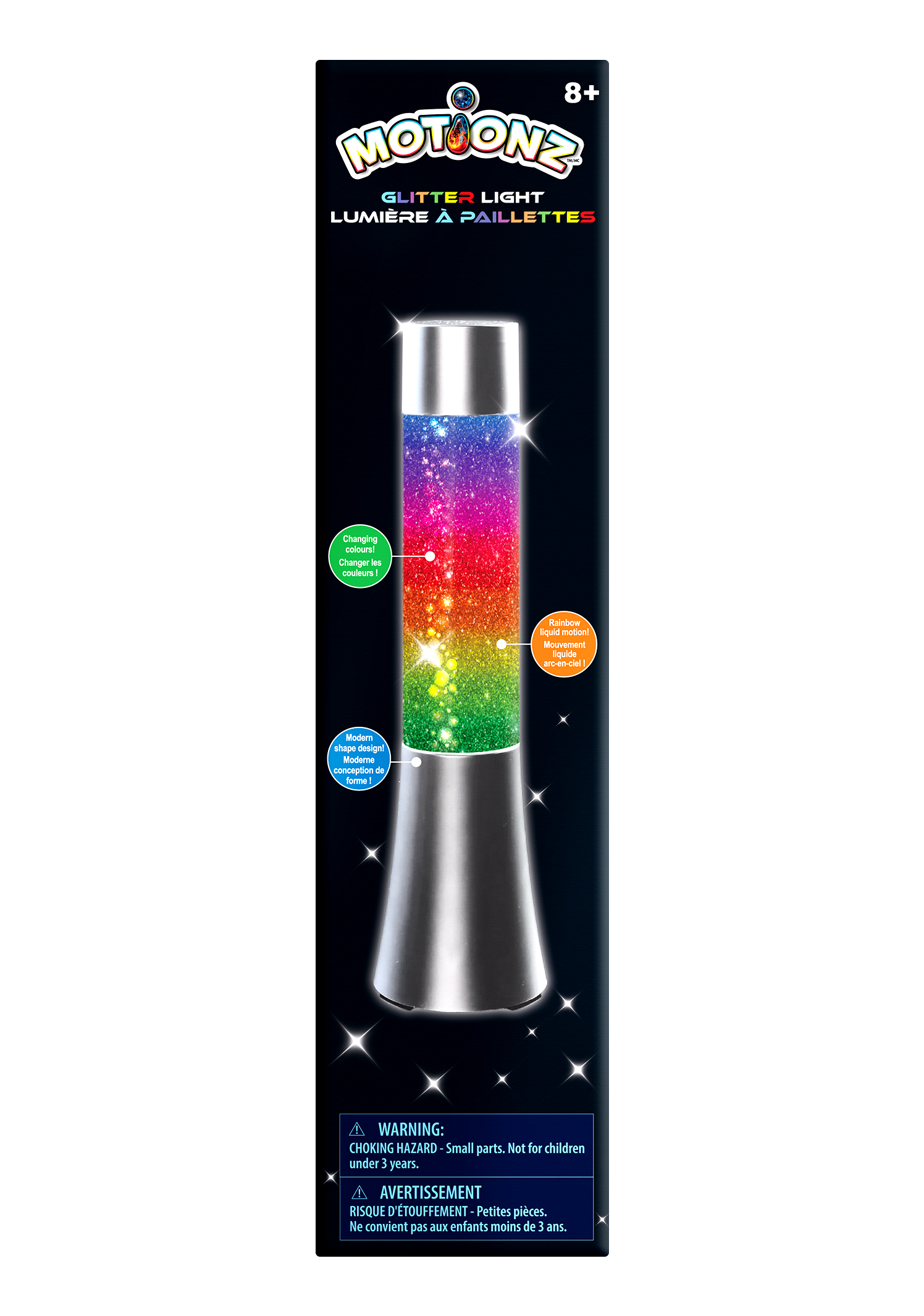 Add a splash of magic to any space with the Motionz Glitter Light! This 13" lamp transforms any room with its captivating color-changing design filled with sparkling glitter. Powered by USB or 3 AAA batteries (not included), it comes with a 1m USB cable for convenience. Ideal for ages 8 and up, it promises endless hours of glittery fun!