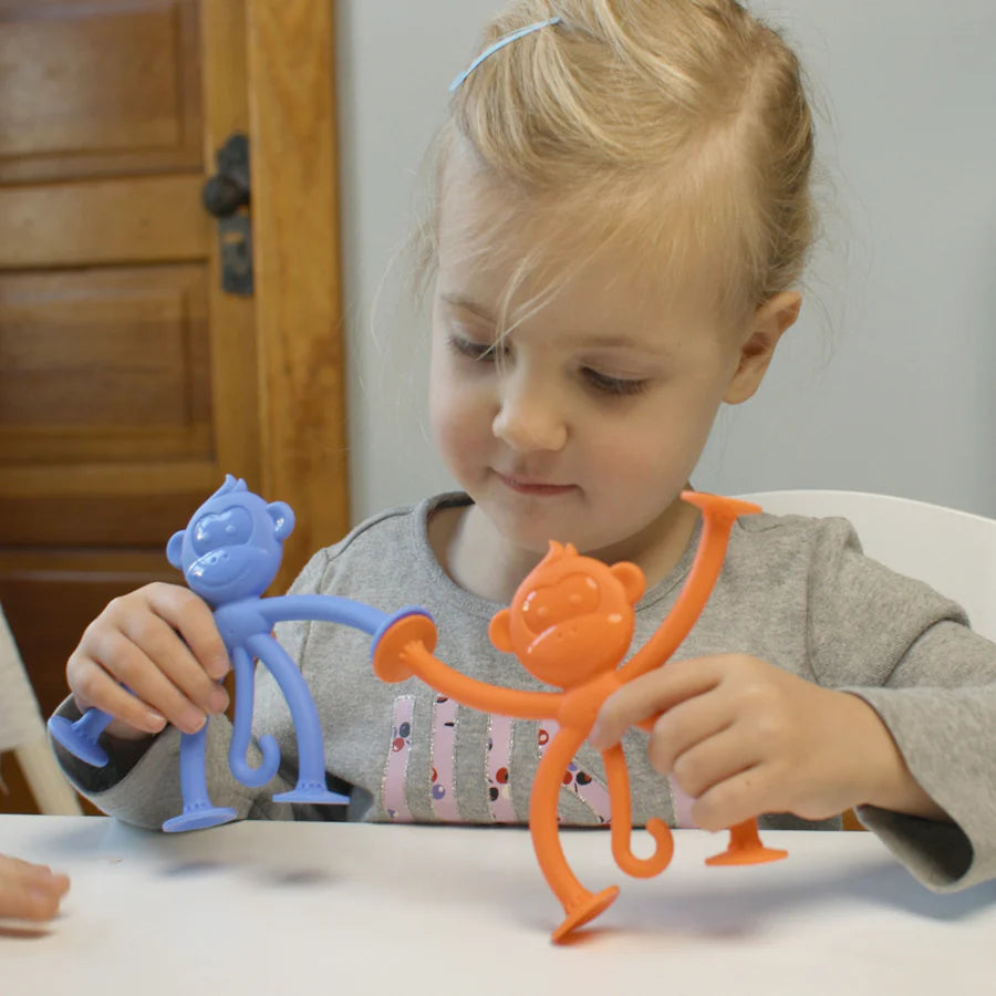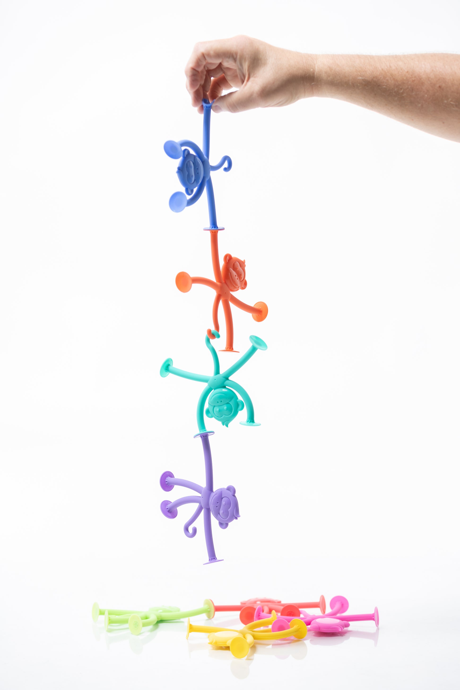 It’s a jungle out there, and little ones go WILD for HangaTangs! These friendly, colorful, STUCKTION friends were developed with the growing child in mind. Perfectly sized for grasping, and large enough for little fingers to push the flat suction cups together and POP apart, this troop of monkeys will keep even the most curious of minds occupied for hours! These primates of play will stick to and hang from any non-porous surface and prove to be perfect for imaginative, and creative fun! Made from food-grade silicone, HangaTangs are perfect for travel, bath time, and anywhere else little minds are going and GROWING! HangaTangs are easy to clean, dishwasher safe, and safe for teething. Ages 10m+