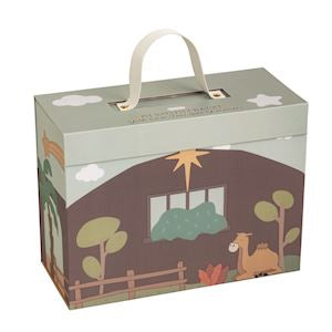 Paper wrapped manger scene suitcase box comes with color-your-own characters and pack of markers. Ages 3+