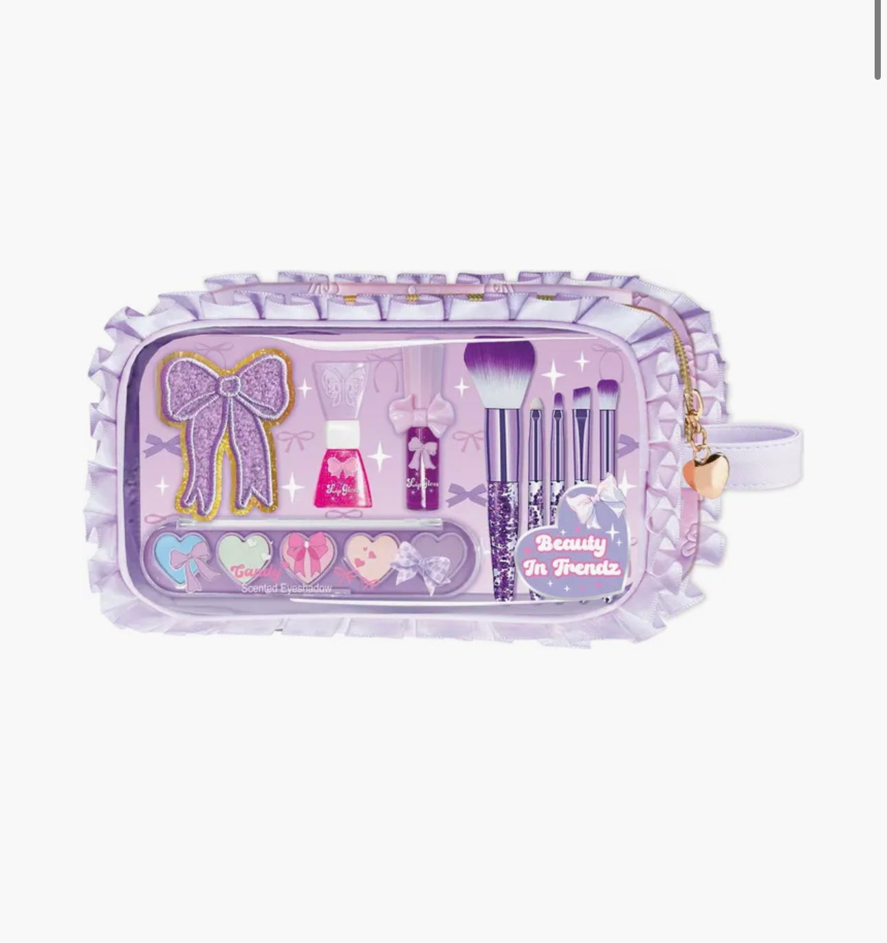A sweet cosmetic kit that features a makeup brush set, two lip glosses, a scented eyeshadow palette and a sticker patch makes the perfect gift for your fashionsetter.