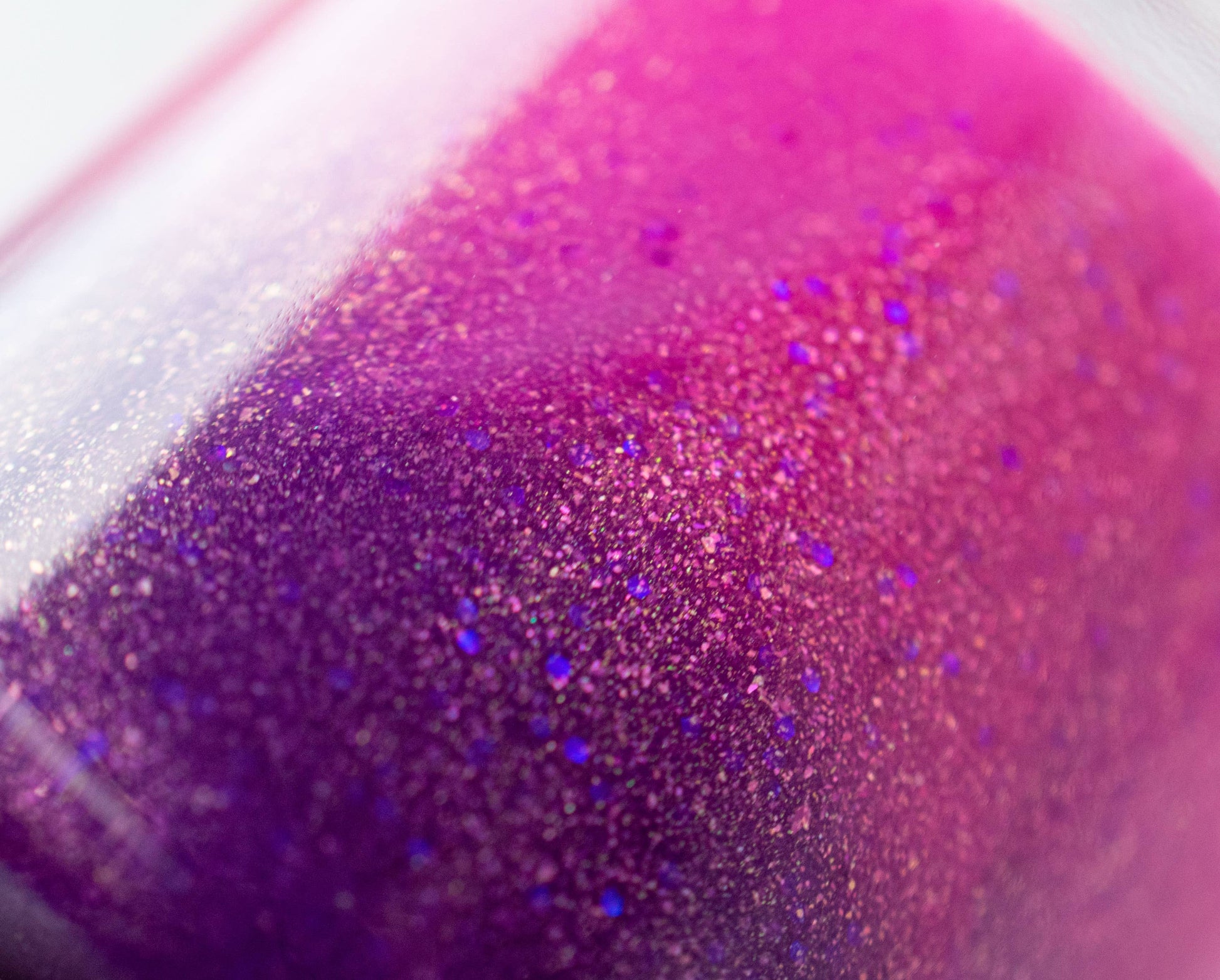 Poolside Paradise is a new mood color changing color! Goes from dark purple when cold, to bright pink magenta when warm! Sunny gold shimmers and purple iridescent glitters are suspended throughout the formula.