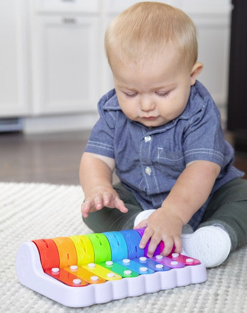 The littlest musicians can spin the wheels to hear each note ring beautifully. Then, as fine motor skills grow, grab the mallet and bang out a lovely melody!