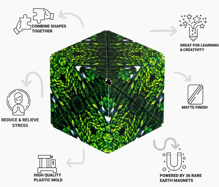 Shashibo cubes are crafted with magnetic technology, allowing them to easily snap into different shapes. The cubes feature vibrant designs and patterns, adding an artistic touch to the interactive experience. The magnetic construction ensures durability and ease of manipulation.