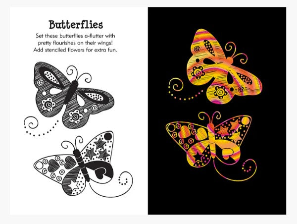 This is a Trace-Along Scratch and Sketch! White outlines on black scratch-off pages create a fun way for younger children (5 and up) to trace the pictures, revealing patterns, swirls, and holographic colors.