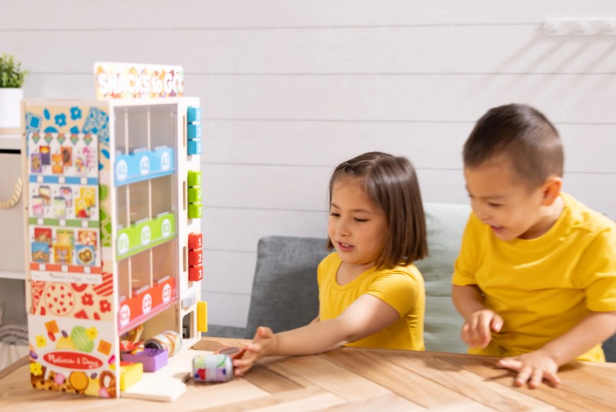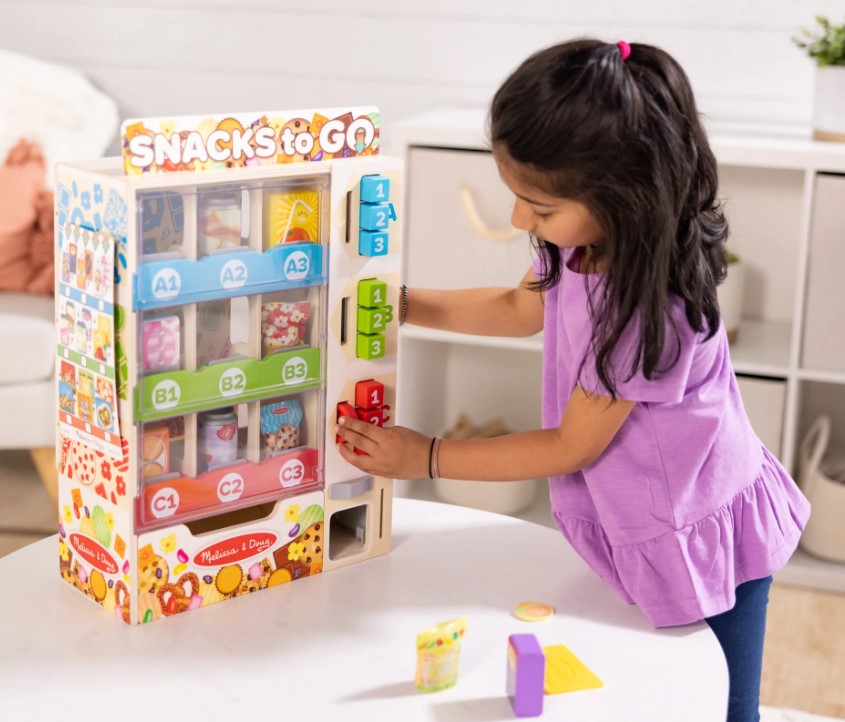 Fun interactive play as you sort, stock, and select play food items in a wooden vending machine with play coins! Includes 19 pieces like snack bars, drink cans, snack pouches, coins, bank card, and more. Enjoy educational fun using the reusable activity card for stocking and display, great for toys and small food packages from home. Encourages skill development by teaching cause-and-effect, imaginative play, sorting, counting, and letter recognition. Ages 3+ Please Call Us to Place Curbside Orders! (281-758-2232)